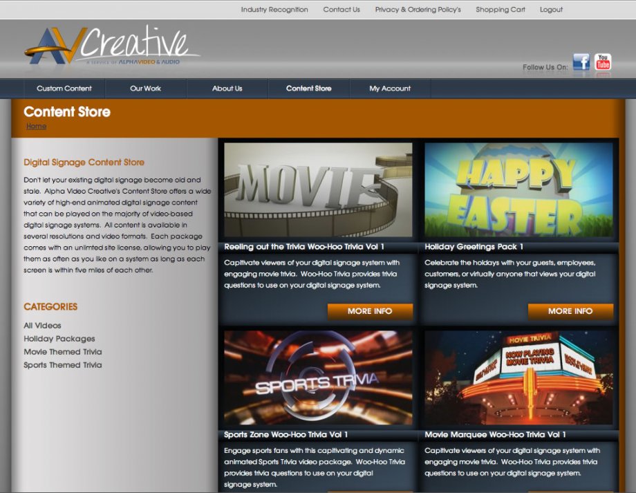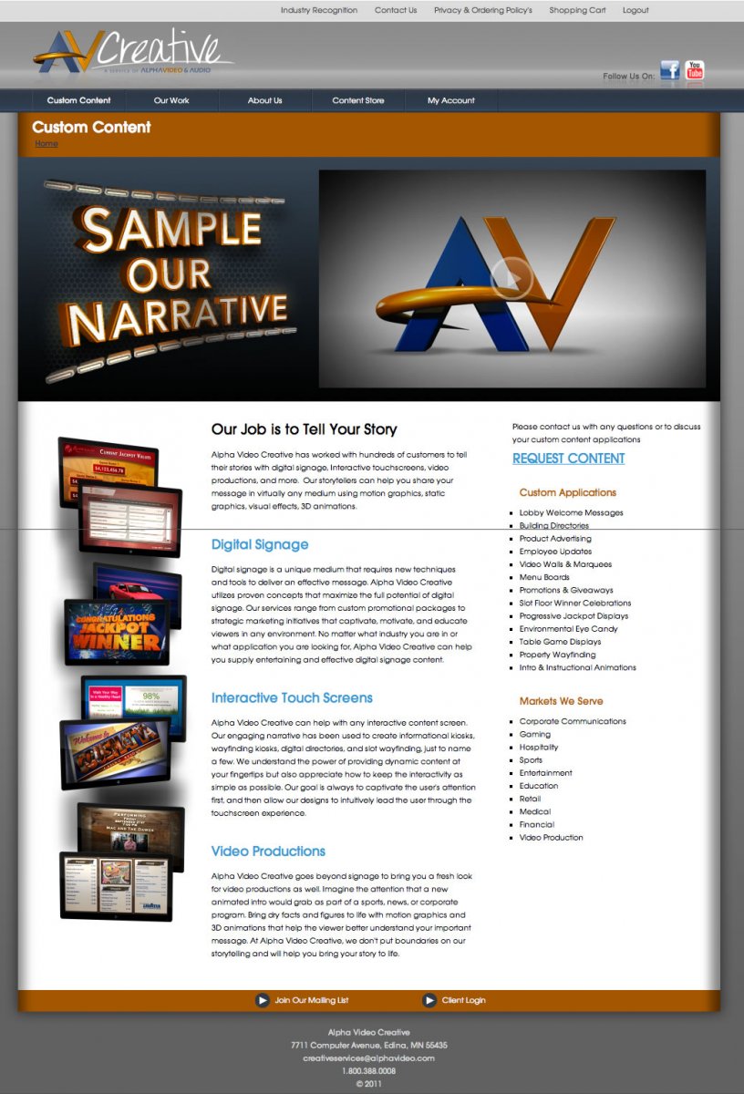 Design for this site was handled internally by the Alpha Video Creative Services team. Check out the site to see examples of their work or browse their digital signage store.