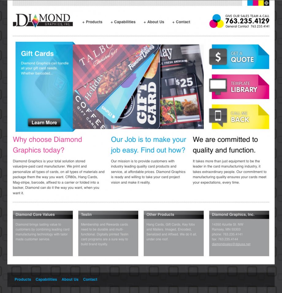Diamond Graphics contacted Mipaca Interactive about updating their website's design and help it rank better in search engines. Mipaca Interactive worked with Malley Design for the website's design and Impermanence Photography for the product photography on the site.